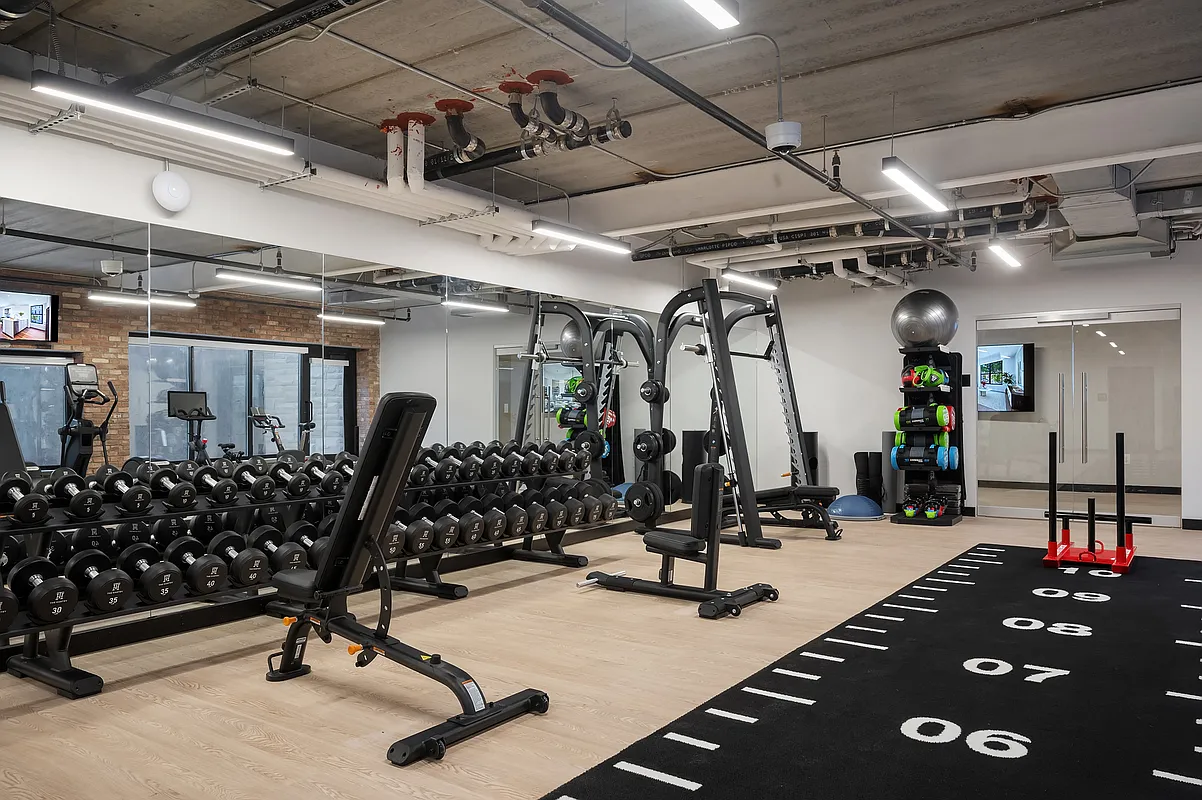 Just as the building carries its signature character, some fitness elements reflect that same iconic quality—like the Hartby-branded dumbbells and the Peloton bikes—tying distinctive finishes to functional performance