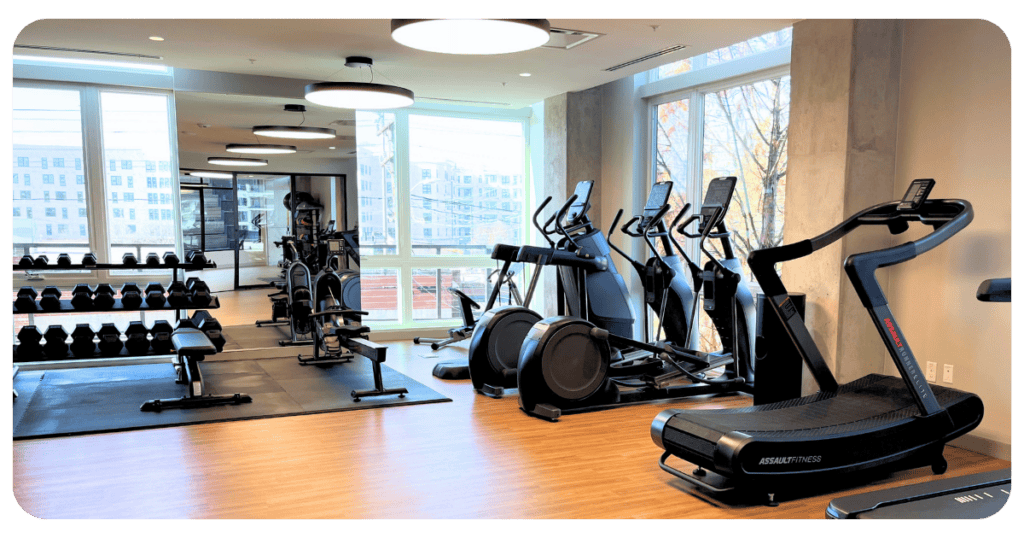- Built-in flex spaces, as seen in the GeerHouse Apartments fitness center in Durham, NC.